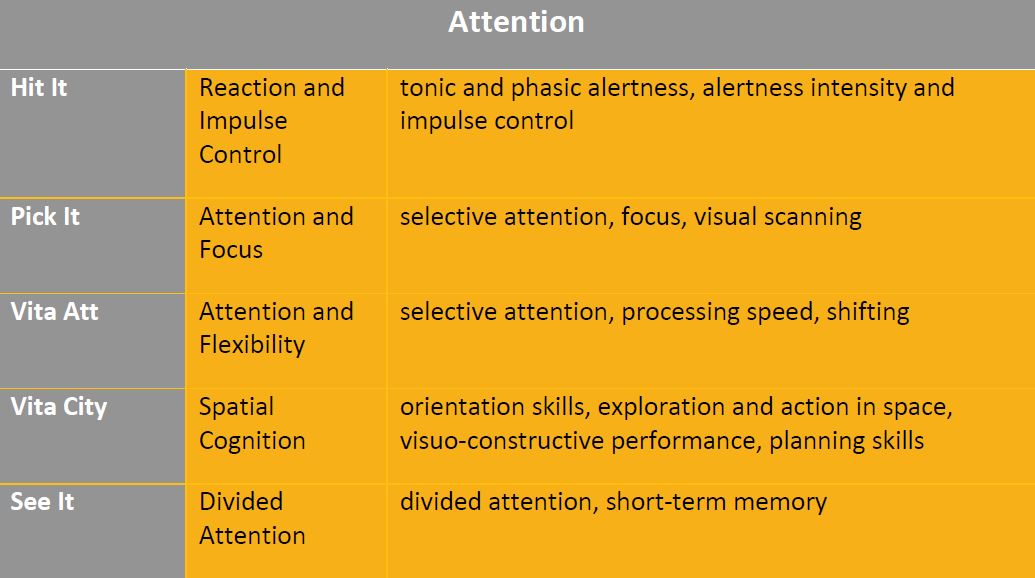 A good working Attention level is the foundation for all continuing cognitive therapy. A patient may not be able to stay focused on a single task, avoiding distractions, can´t move from one task to another very easily, can´t do more than one thing at once, and can´t process things very quickly.