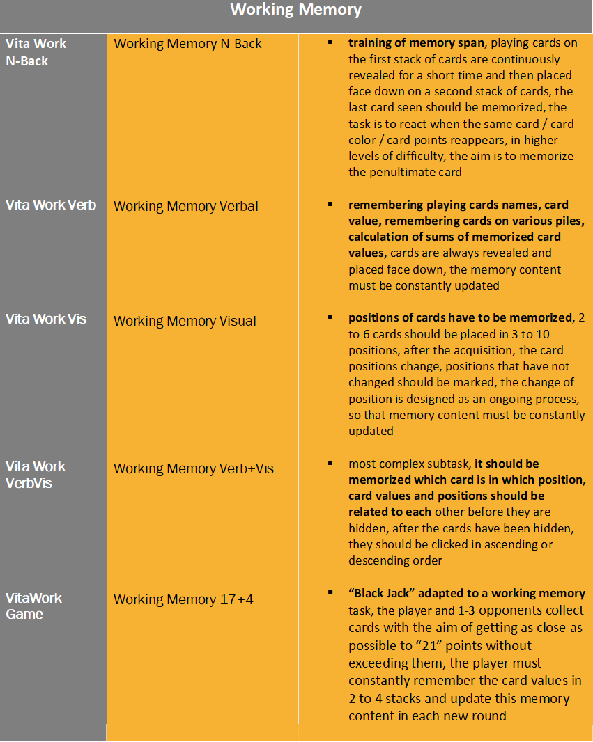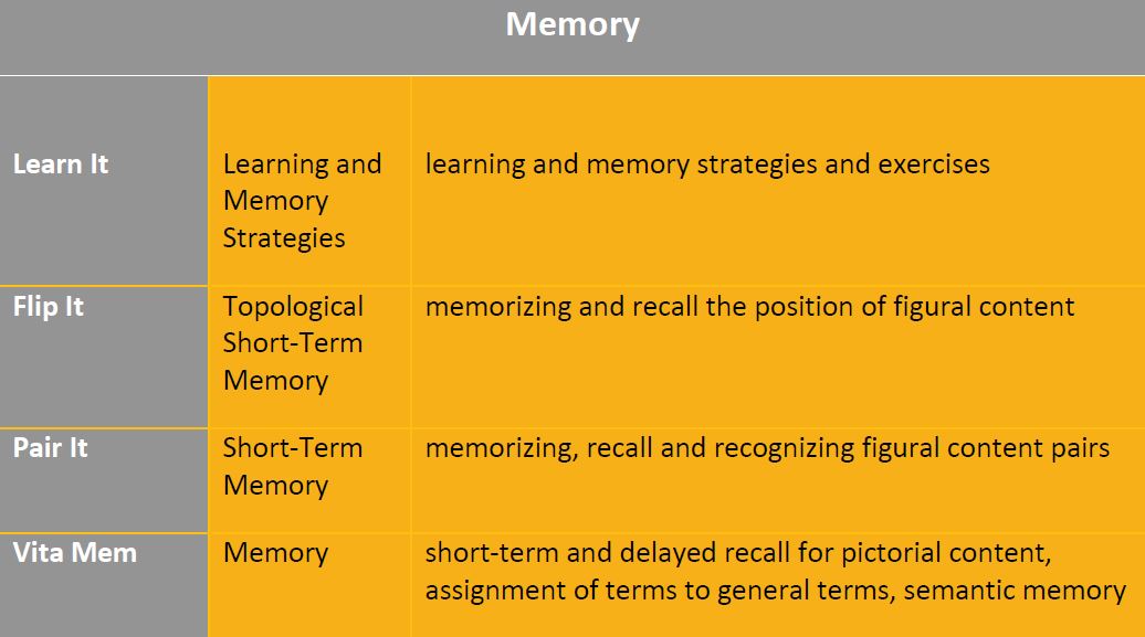 Deficits in Memory functioning are very common in individuals following acquired neurocognitive impairment, neurodegenerative disease or associated with psychiatric trauma. Memory exercises with HeadApp reinforce internal learning strategies and help to establish compensation techniques.