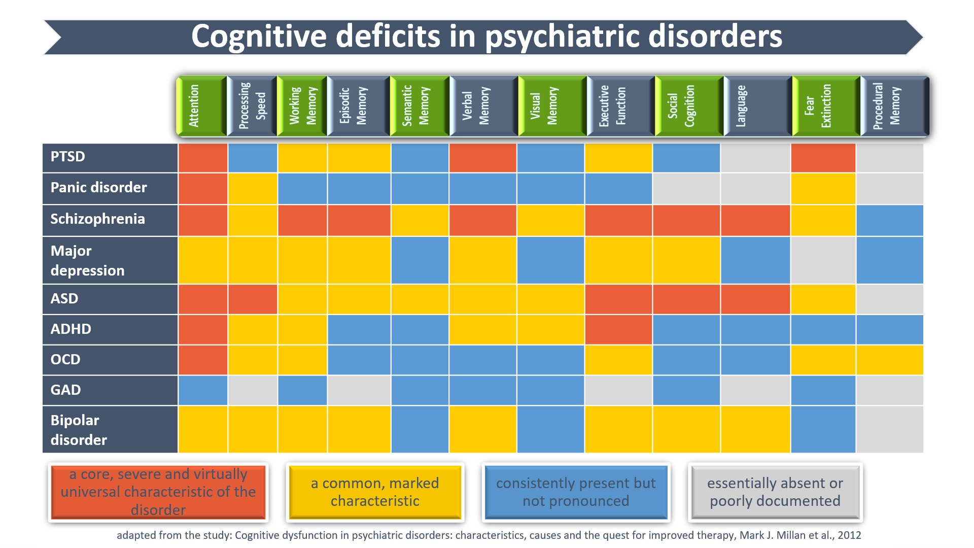 Deficits in cognitive function – ranging from decreased attention and working memory to disrupted social cognition and language – are common in psychiatric disorders.